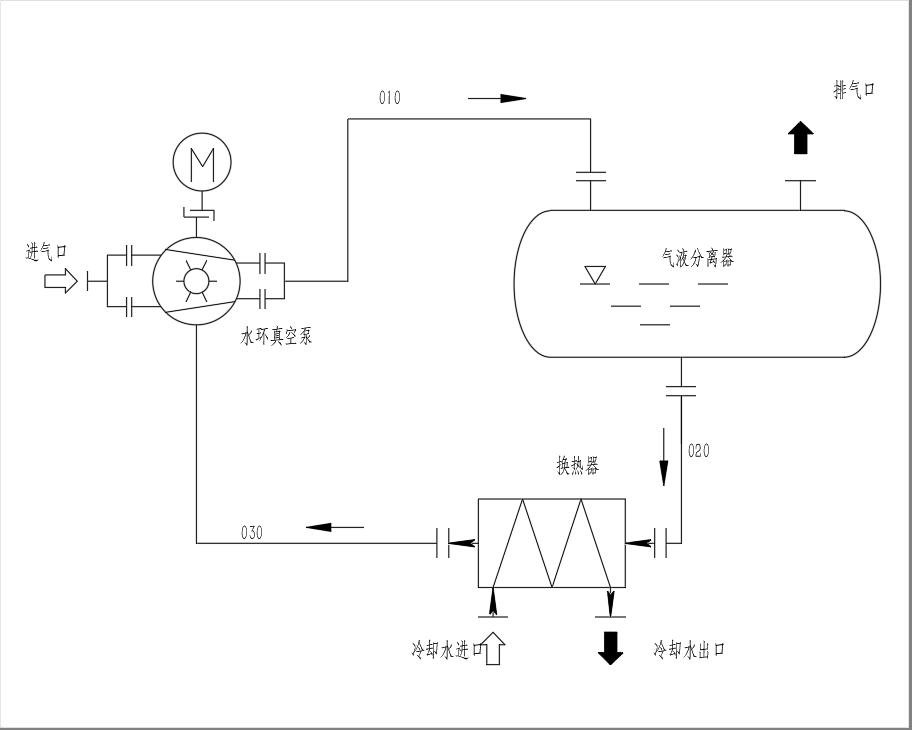 被抽氣體從吸氣口進(jìn)入液環(huán)真空泵,經(jīng)液環(huán)真空泵壓縮后與部分工作液一起由010管線進(jìn)入氣液分離器,在氣液分離器內(nèi)氣液兩相得到分離,氣體從排氣口排出,工作液經(jīng)020管線至換熱器冷卻后經(jīng)由030管線被液環(huán)泵吸入進(jìn)行循環(huán)使用。